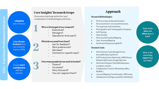 Users’ Insights – Learn to use the most convenient approach for different research scenarios, to collect and analyse insights from software users and key stakeholders. These insights are instrumental to explain KPI progression, identify roadblocks and outline corrective measures to ensure smooth adoption.