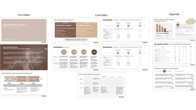 Coaching sessions designed to guide you in kicking off Value Realization with your first customer. This on-the-job support includes an initial business case and user research plan, with assistance after 3 and 6 months for value tracking, assessment, and VR report delivery.